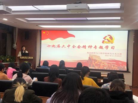 11月26日晚,2021级研究生党支部召开支部大会,集体学习十九届六中全会精神,认真领会《公报》的核心要义。通过集体学习,党员同志们进一步感受了党的百年奋斗历程,进一步加深了对十九届六中全会精神的理解。大家纷纷表示,要争做有理想、有本领、有担当的时代青年,不负青春,不负韶华。
