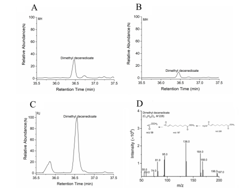 癸烯二酸在成熟蜂蜜(A),未成熟蜂蜜(B),蜂王浆(C)中的气相色谱质谱图及其离子碎片图(D)