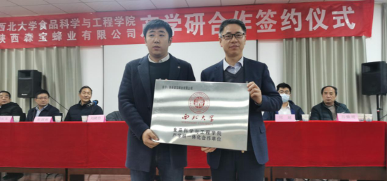 我院曹炜教授介绍了陕西蜂业的发展现状和陕西省蜂产品工程技术研究中心的情况,指出养蜂是空中农场,是环保产业、绿色产业、健康产业,希望通过合作,促进食品人才培养,促进森宝蜂业提质增效,推动脱贫攻坚和乡村振兴,助力宝鸡早日建成我国蜜都,树立宝鸡市蜂产品品牌。双方代表进行了签约、授牌。
