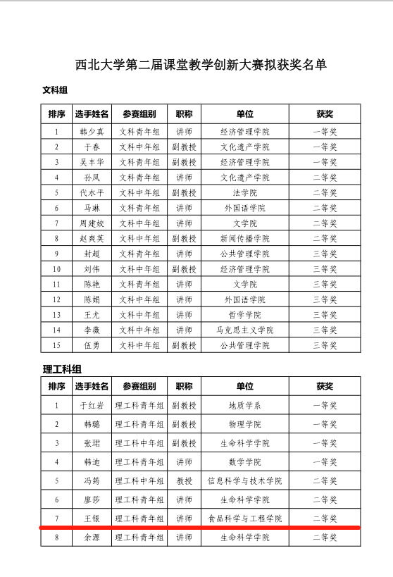 在9月4日举行的西北大学第二届课堂教学创新大赛中,我院青年教师王银以精彩的表现获得理工科二等奖,为我院争得了荣誉。
