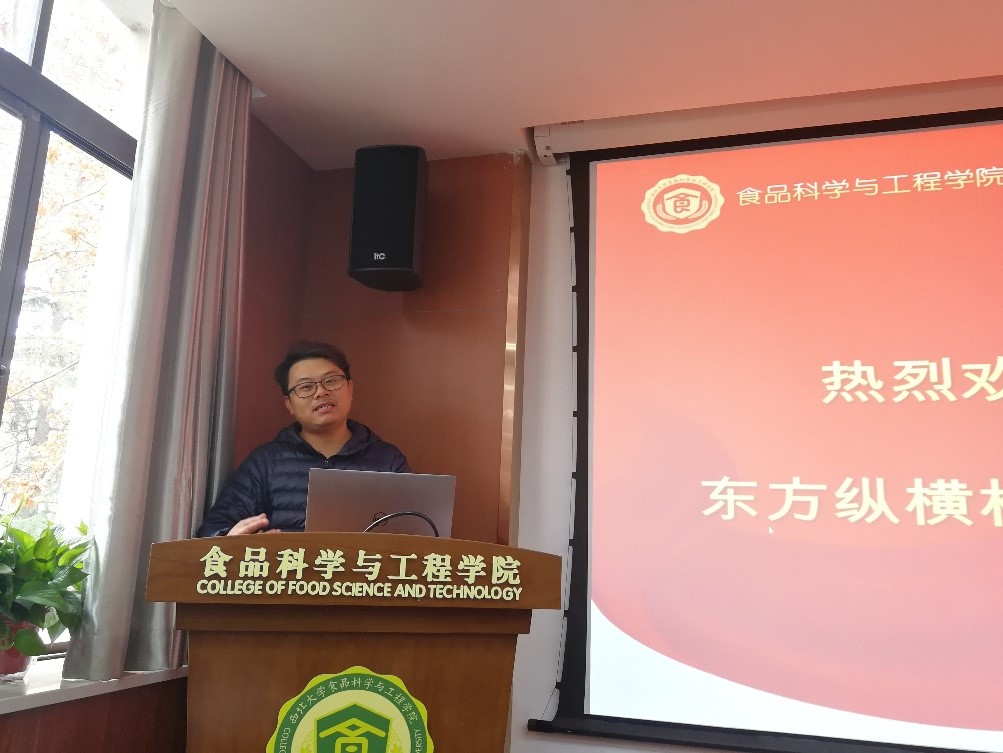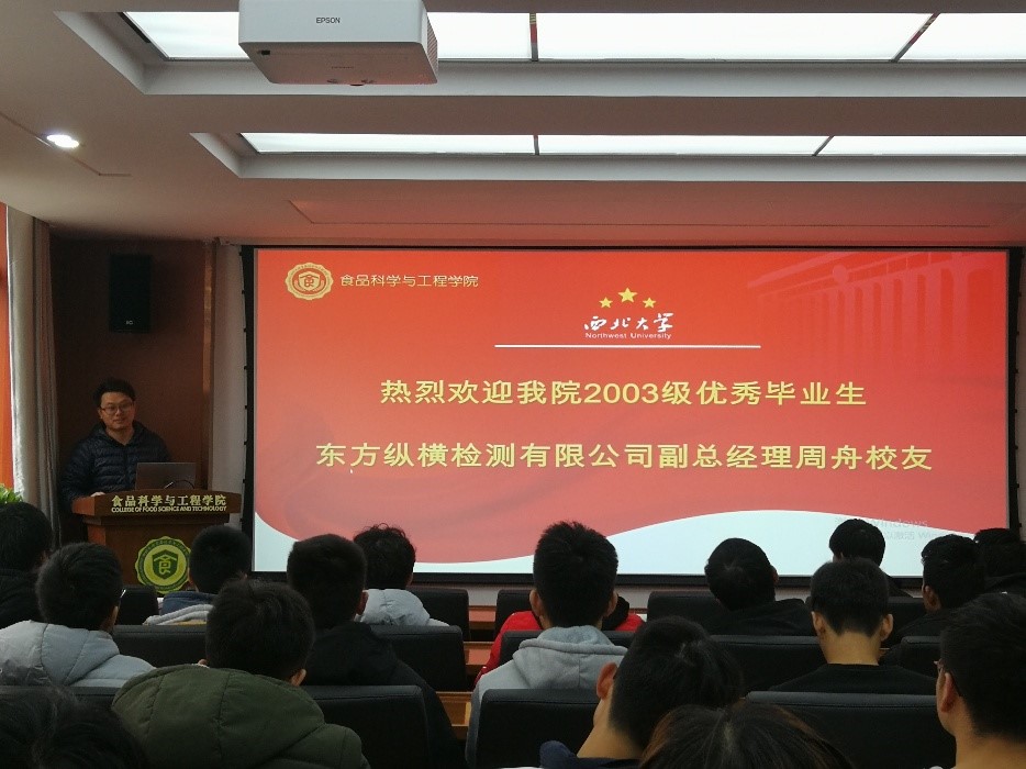 2019年12月16日下午,我院2003级食品科学与工程专业优秀毕业生广东东方纵横检测有限公司创办人兼副总经理周舟返校并与2019级新生进行了深入交流,我院副院长曹炜教授参加了交流会。