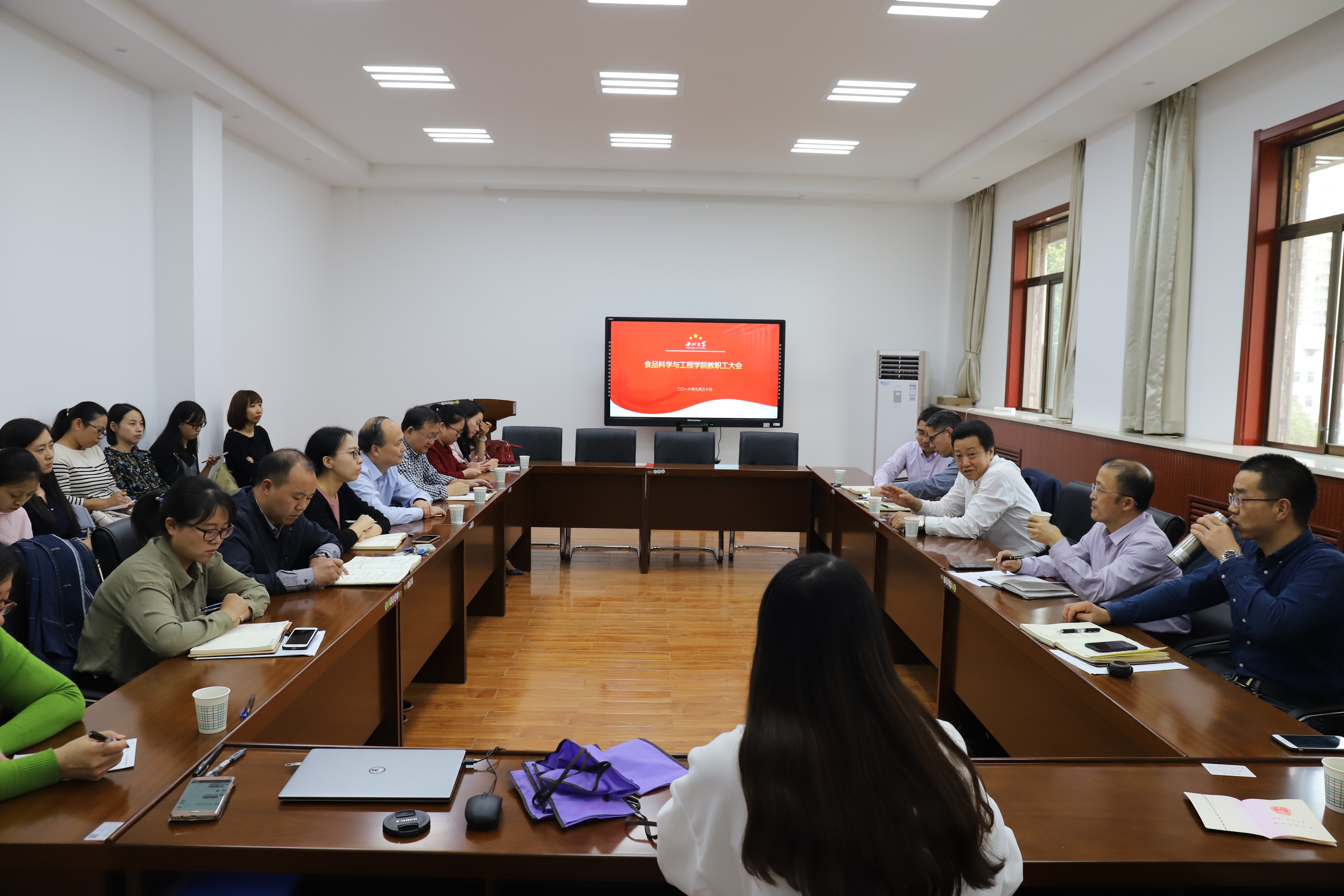 岳田利院长向全院教职工介绍了太白校区教学六号楼的建设推进情况、长安校区食品大楼的规划、学院、学科两个规划进展情况、学院公共学科平台建设情况、工程教育认证工作、教学实验室建设情况等学院各项工作进展情况;赵会武副院长对假期实验室安全、教师人身安全做出了部署和提醒;欧建东副书记通报了我院2018届毕业生就业率、2018级新生入学率、2015级本科生推荐免试攻读研究生等情况;曹炜副院长安排了完全学分制、工程教育认证、教学质量提升等具体教学工作。会议中大家积极探讨,献言献策。