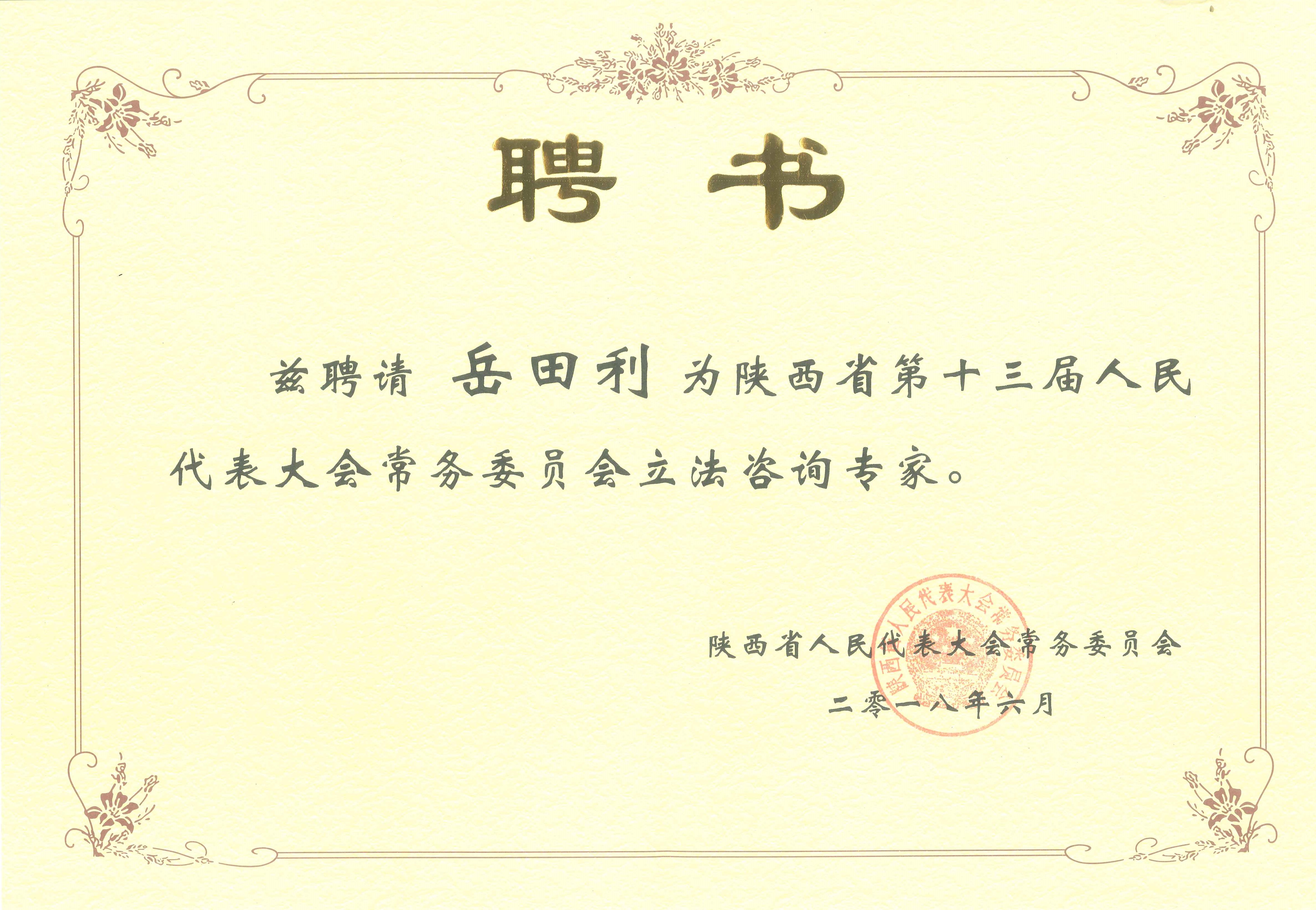 2018年6月,陕西省人大常委会办公厅印发文件,我院院长岳田利教授被聘请为陕西省第十三届人大常委会立法咨询专家,并参加6月26日在省人大常委会机关楼一层多功能厅举行的聘任仪式,从省人大常委会副主任梁宏贤手中接过聘书。