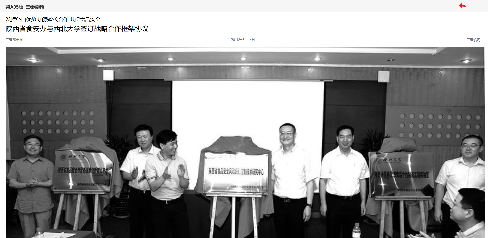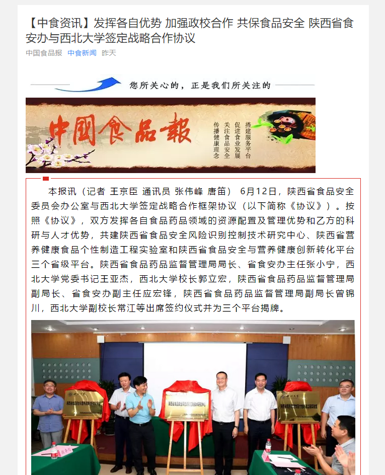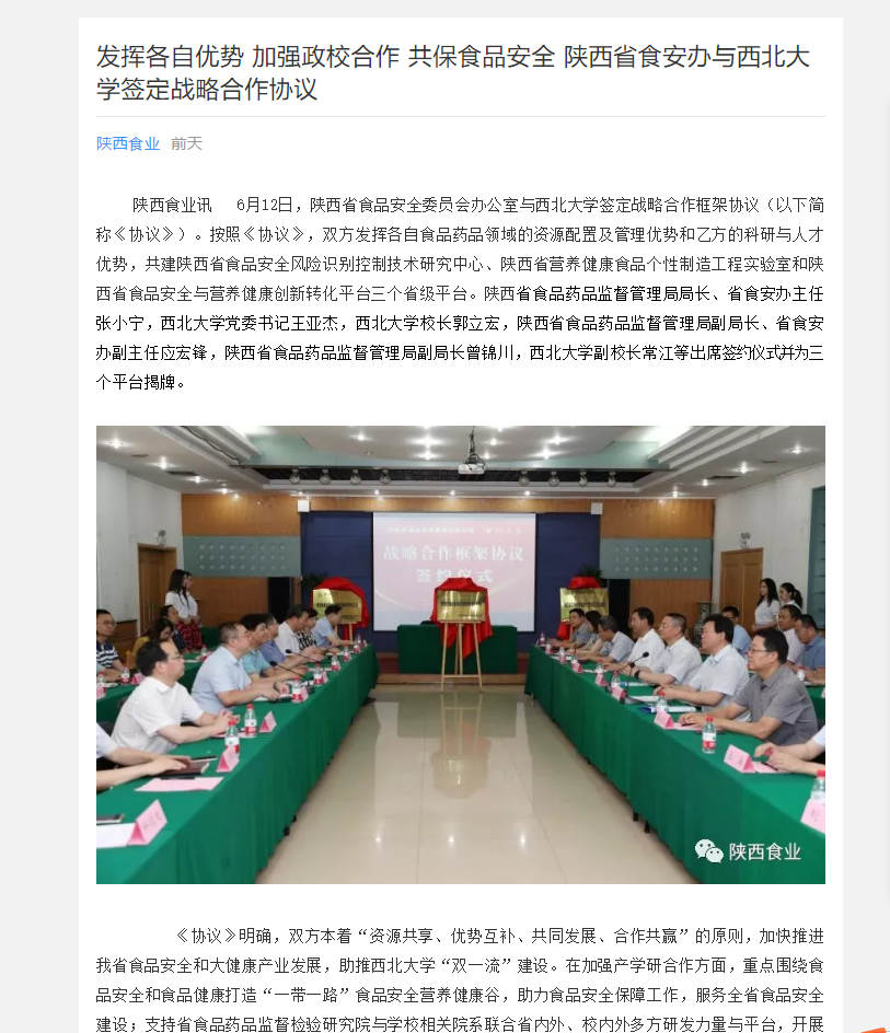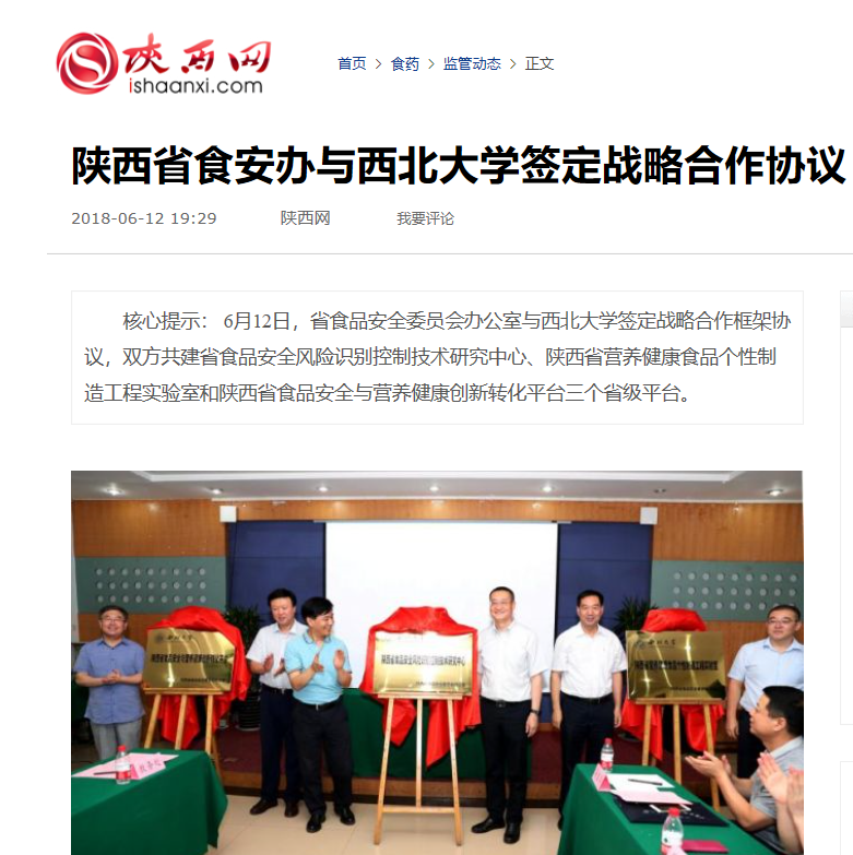 6月12日下午,陕西省食品安全委员会办公室与我校战略合作框架协议签约仪式在太白校区举行。双方共建陕西省食品安全风险识别控制技术研究中心、陕西省营养健康食品个性制造工程实验室和陕西省食品安全与营养健康创新转化平台三个省级平台。