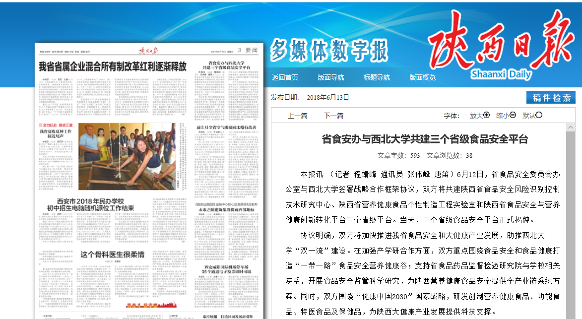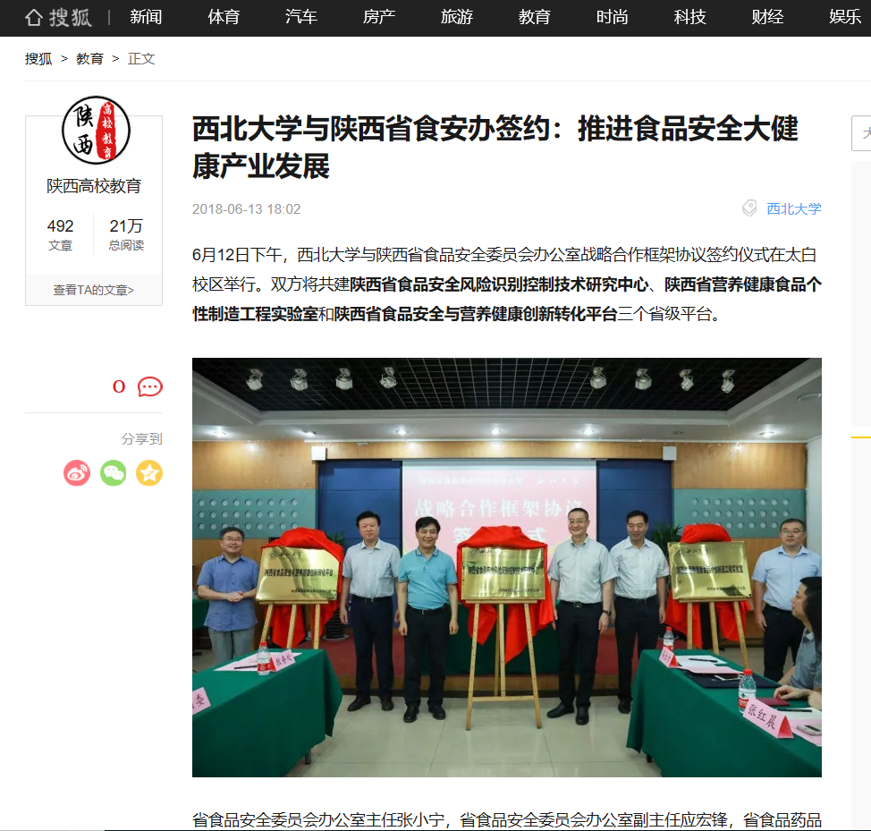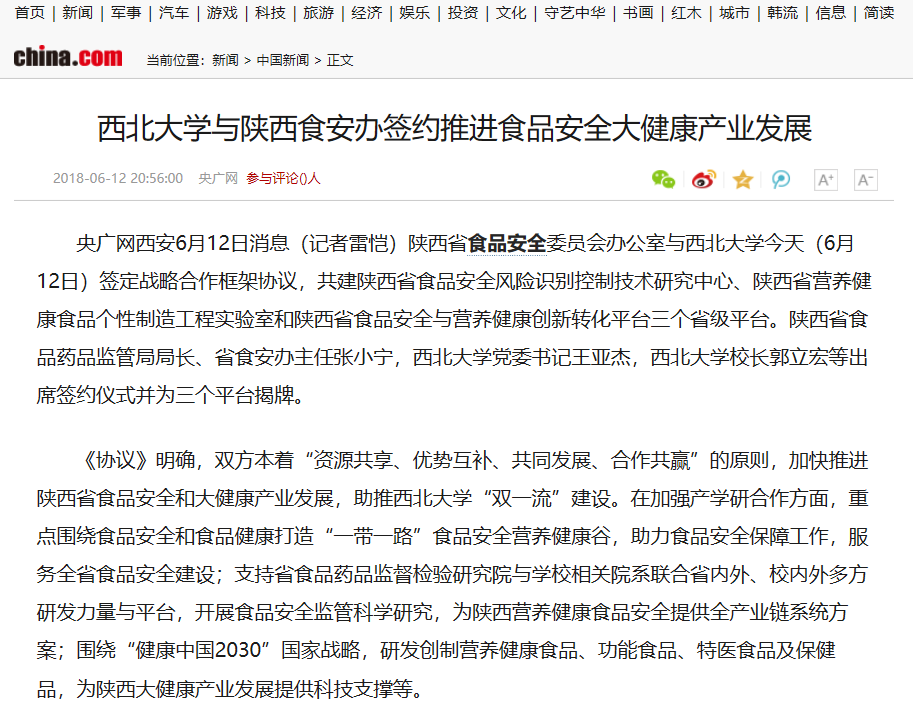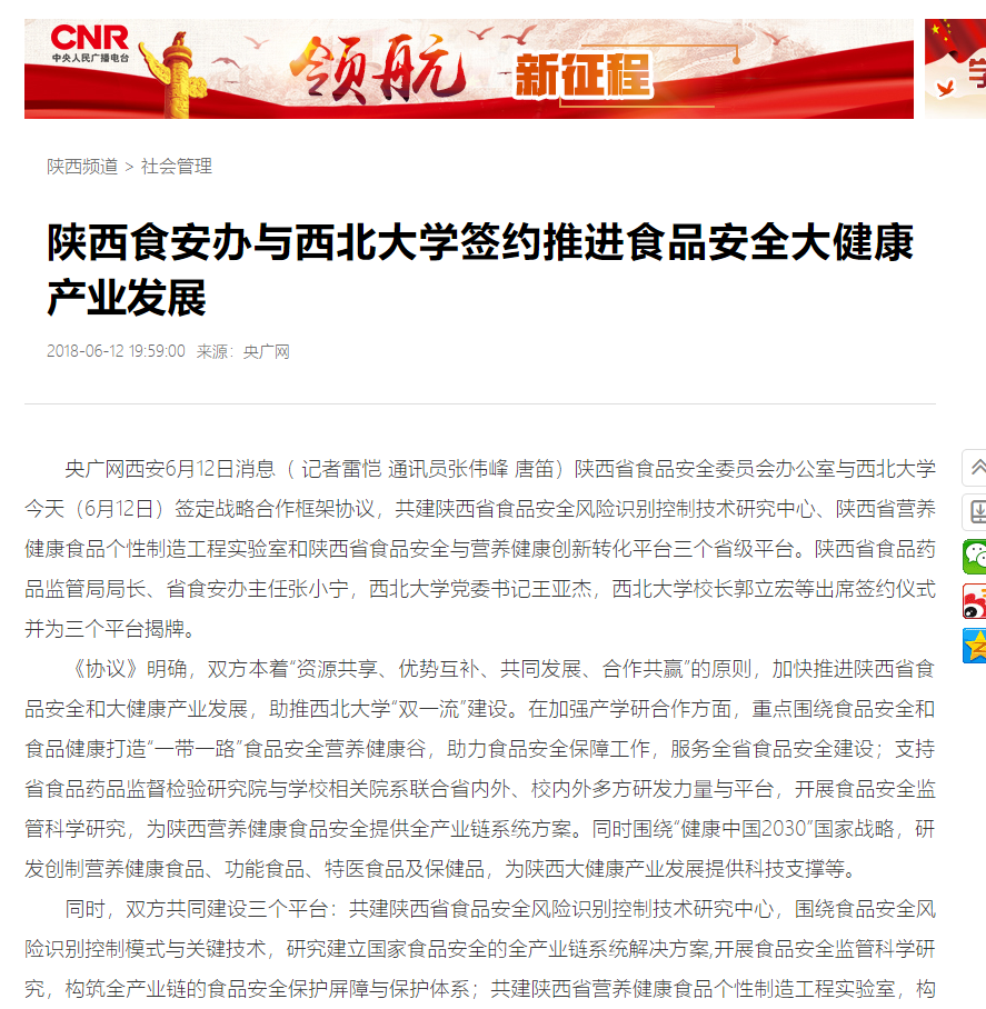 6月12日下午,陕西省食品安全委员会办公室与我校战略合作框架协议签约仪式在太白校区举行。双方共建陕西省食品安全风险识别控制技术研究中心、陕西省营养健康食品个性制造工程实验室和陕西省食品安全与营养健康创新转化平台三个省级平台。