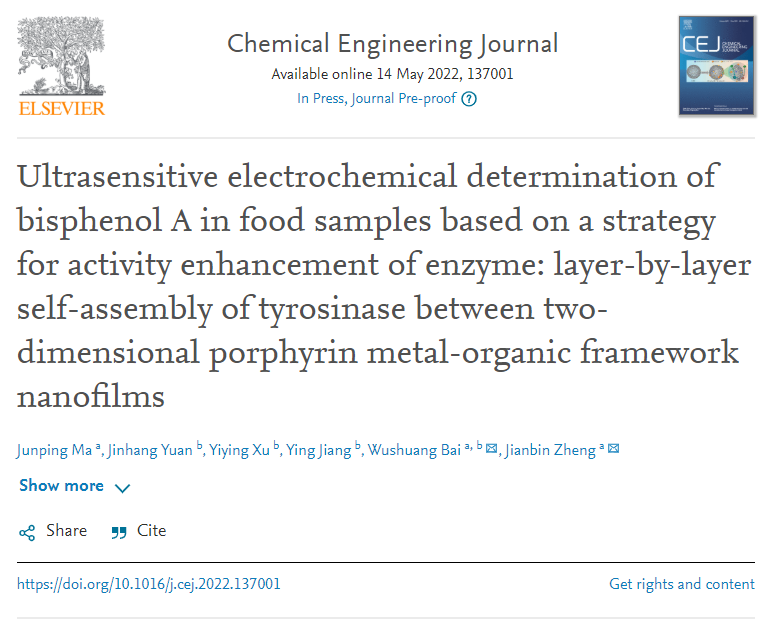 近日,我院青年教师白武双副教授指导本科生(2017级袁锦航、姜英,2018级徐懿莹)在国际顶级期刊《Chemical Engineering Journal》(中科院1区TOP,Q1区,2020-2021年影响因子13.273,即时影响因子>16)上在线发表了最新科研成果:“Ultrasensitive electrochemical determination of bisphenol A in food samples based on a strategy for activity enhancement of enzyme: layer-by-layer selfassembly of tyrosinase between two-dimensional porphyrin metal-organic framework nanofilms”(Chemical Engineering Journal,doi: https://doi.org/10.1016/j.cej.2022.137001)。该成果孵化于陕西省大学生创新创业训练计划项目(牛奶中双酚A的快速测定,No. S202010697171,项目负责人:2017级本科生袁锦航,参与人:2017级本科生姜英、2018级本科生徐懿莹),体现了我院对本科生科研能力培养的高度重视。