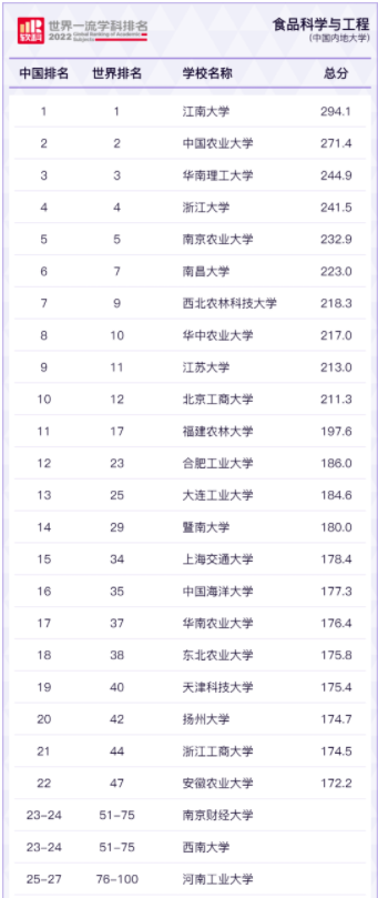 近日,2022软科世界一流学科排名发布。在本次2022软科世界一流学科排名中,中国内地大学的食品科学与工程学科共有71所上榜,占据了前300名的24%。其中,我校食品科学与工程学科进入全球前151-200名,国内44名。这是继2020年6月29日,上海软科发布2020软科世界一流学科排名,我校食品科学与工程学科排名201-300名后所取得的巨大进步。另外,我院和兄弟院系共同支持的西北大学农学学科也进入了全球301-400名,国内位居64名。