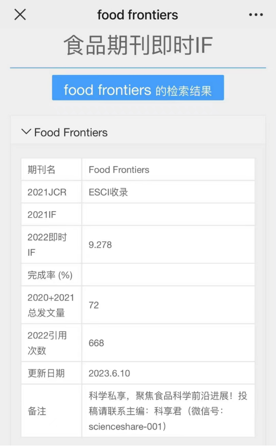 2023年6月以来,《Food Frontiers》IF突破 9,超越FC和FR,迎来了新的发展阶段。