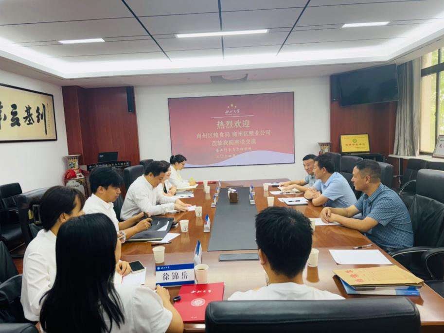2024年8月10日,陕西省商洛市商州区粮食局局长祁丹军、商州区粮业有限责任公司董事长郭建东等一行六人到访我院进行座谈交流。岳田利院长、袁亚宏教授及营养健康食品制造与安全控制团队相关教师出席座谈会。