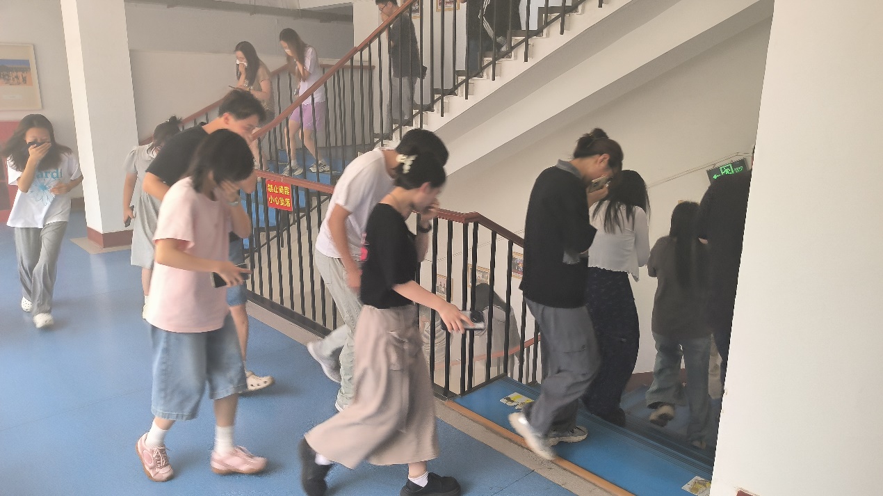 2点30分,随着一阵急促的警报声响起,演练正式拉开帷幕。食品学院全体师生迅速反应,按照预定的疏散路线,用湿毛巾捂住口鼻,弯腰低姿,快速、有序地撤离教学楼。在疏散过程中,各楼层引导员恪尽职守,确保师生疏散安全、高效。仅用时2分钟,全体人员便安全疏散至指定的汇合合点。