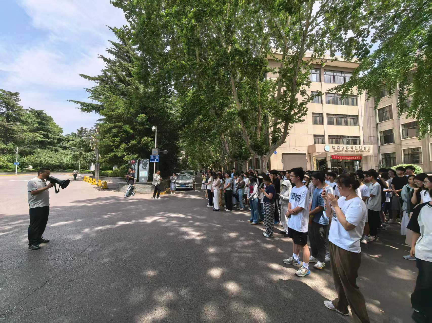 下午2点20分,全体演练人员在食品学院院楼下集合。张远安强调了在日常工作学习生活中,大家一定要具有居安思危,思则有备,有备无患的指导思想,注重本次演练,培养起良好的避险能力和素质,娄彦功介绍了“6·11”消防演练日的来历,王毅强调了应急疏散演练时的注意事项和要求。随后,所有师生进入院楼就位。