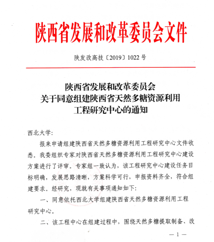 近日,我院王仲孚教授负责申报的陕西省天然多糖资源利用工程研究中心获陕西省发展和改革委员会批准立项(陕发改高技【2019】1022号)。