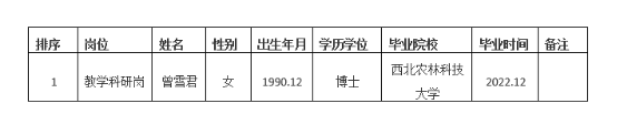 经本人申请、学院资格审查、考核等环节,我院拟确定下列人员来我院工作。本着公平、公开、公正的原则,现将本次选聘人员基本情况公示如下: