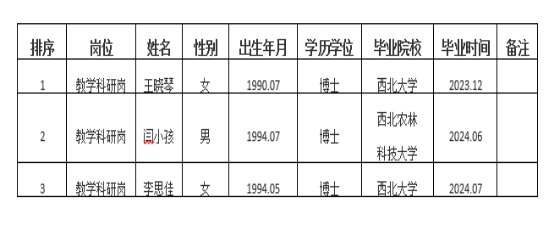 经本人申请、学院资格审查、面试选拔考核等环节,我院拟确定下列人员来我院工作。本着公平、公开、公正的原则,现将本次选聘人员基本情况公示如下:
