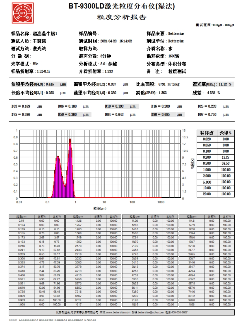9. 测试结果:累计粒度分布(数据和曲线);区间粒度分布(数据和直方图);中位径(D50);平均径;比表面积