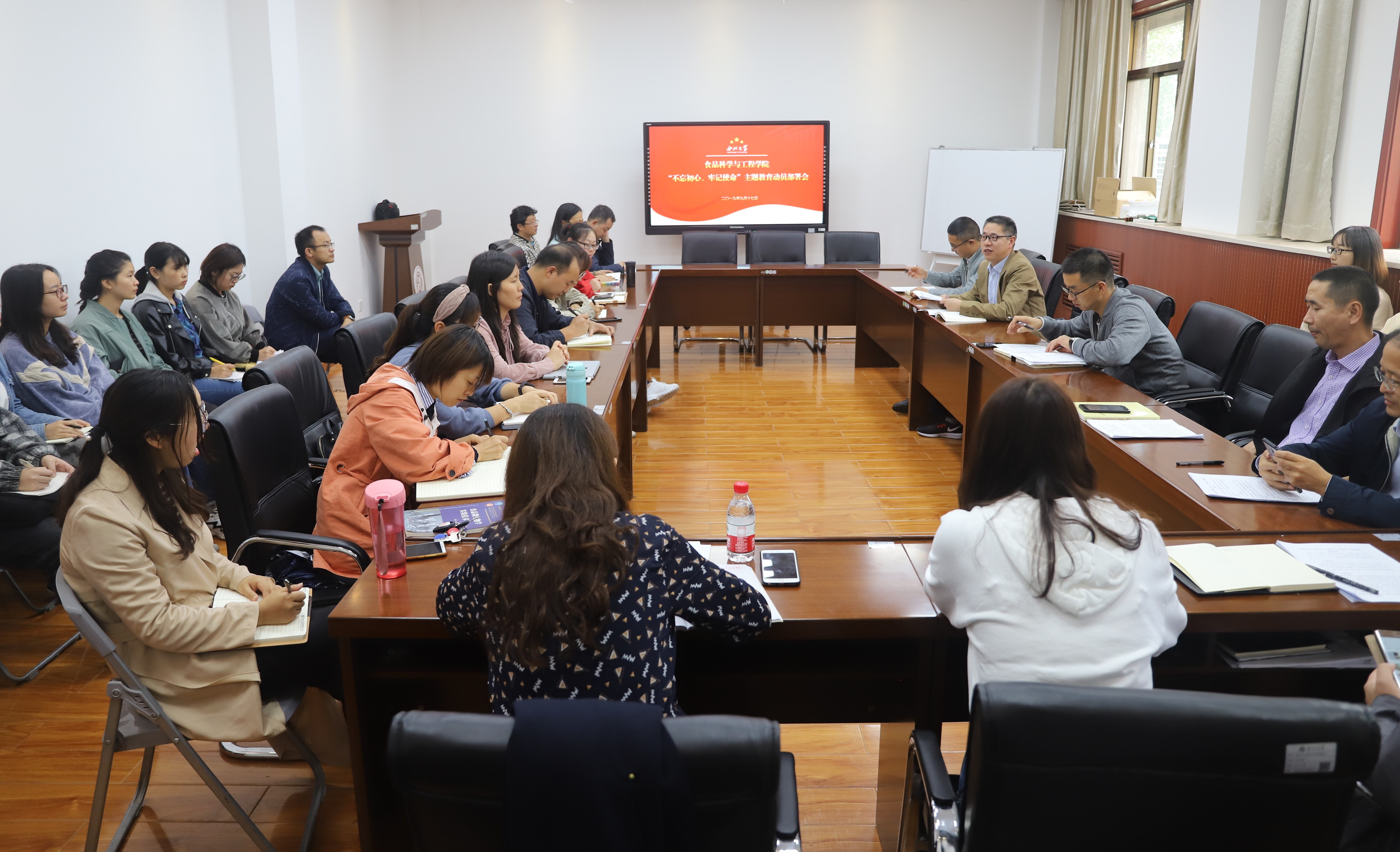 刘晓忠书记强调,在全党开展“不忘初心、牢记使命”主题教育是党的十九大作出的重大部署,今年是中华人民共和国成立70周年,也是我们党在全国执政第70个年头,在这重大时间节点开展“不忘初心、牢记使命”主题教育,正当其时、意义重大。学院全体党员要把深入学习贯彻习近平新时代中国特色社会主义思想这一根本任务作为最突出的主线,落实到主题教育全过程各方面。要把握总要求,围绕履行中央、省委以及学校党委赋予的职责任务找差距、抓落实,为学院发展建设提供强大动力。学院党政班子和班子成员要紧扣“理论学习有收获、思想政治受洗礼、干事创业敢担当、为民服务解难题、清正廉洁作表率”的具体目标带头抓好落实,坚持把学习教育、调查研究、检视问题、整改落实贯穿主题教育始终,力戒形式主义,坚持问题导向,以好的作风确保主题教育取得好的效果。全体党员要切实增强责任感和紧迫感,把开展好主题教育作为推动学院又快又好发展建设的强大动力抓紧抓好抓实。