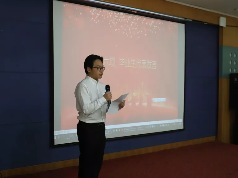 赵磊同学代表2019届毕业生发言,她向学院及各位老师表示了诚挚的谢意,用淳朴温暖的语言回顾了大学四年学习,生活的点滴,讲述了学校、学院的巨大变化和带给自己的改变,同时表达了对学校和学院的依依不舍。