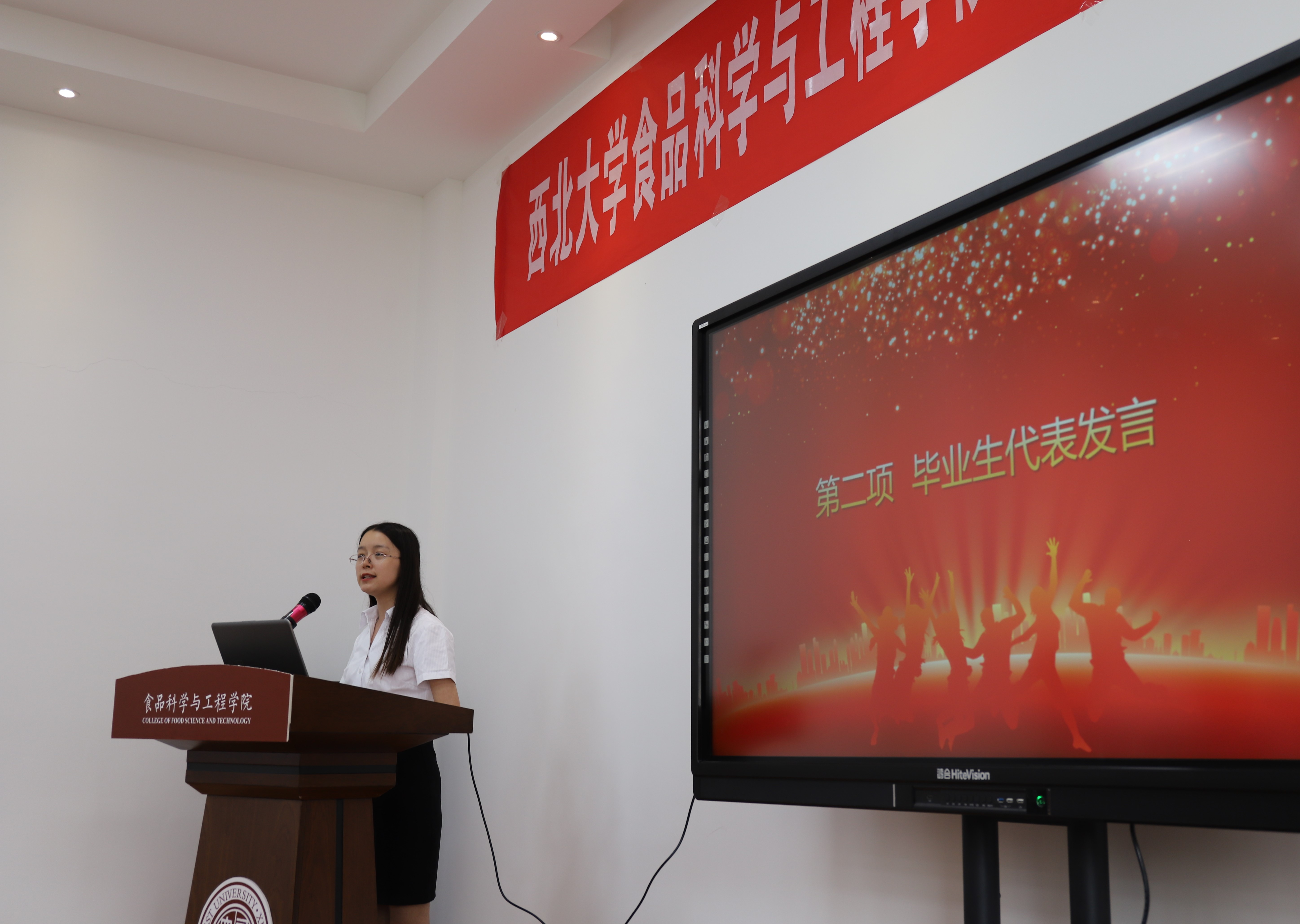 孙媛媛同学代表2018届毕业生发言,她向学院及各位老师表示了诚挚的谢意,用简介淳朴的语言回顾了大学四年学习,生活的点点滴滴,讲述了学校、学院的巨大变化和带给自己的改变,同时表达了对学校和学院的依依不舍。