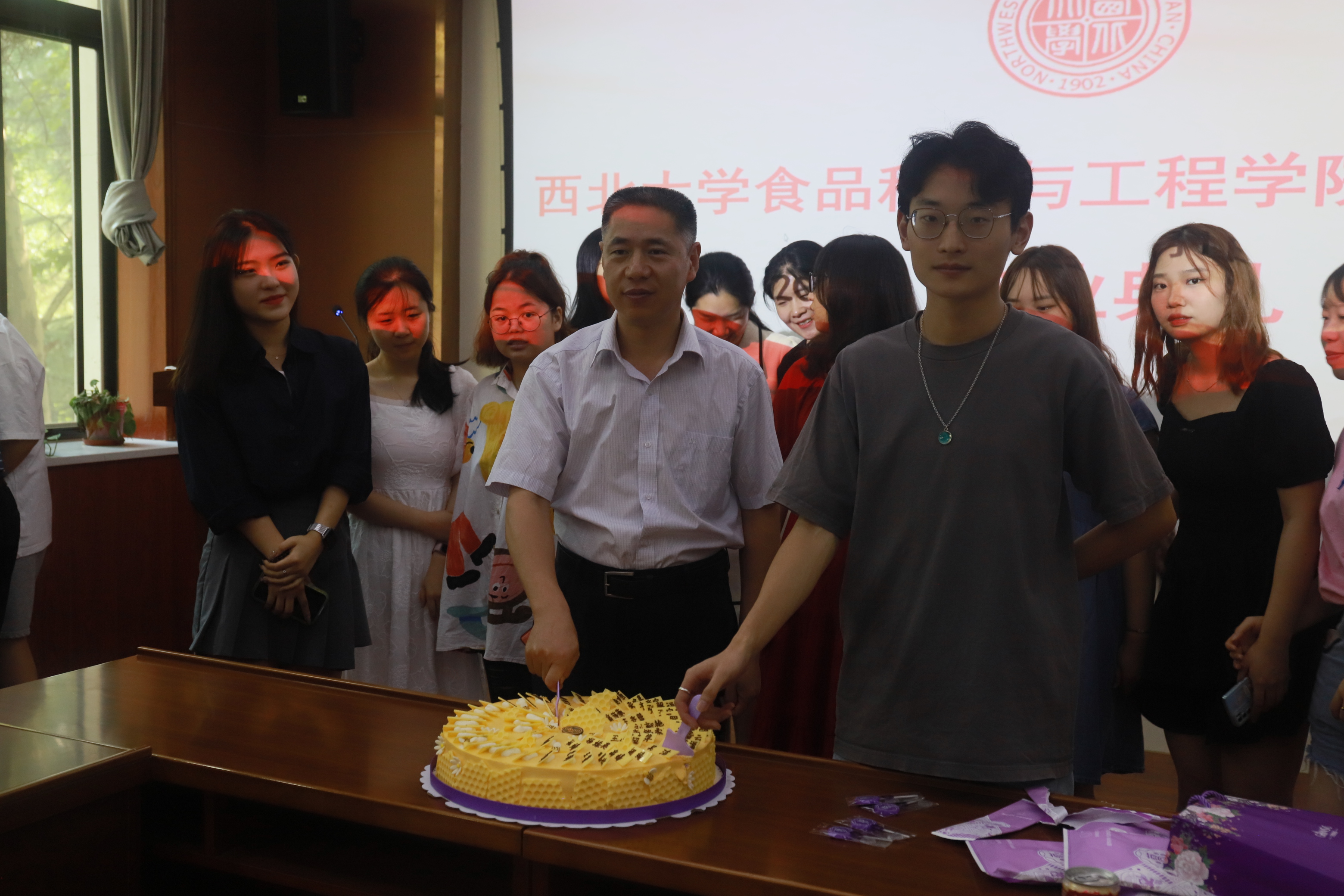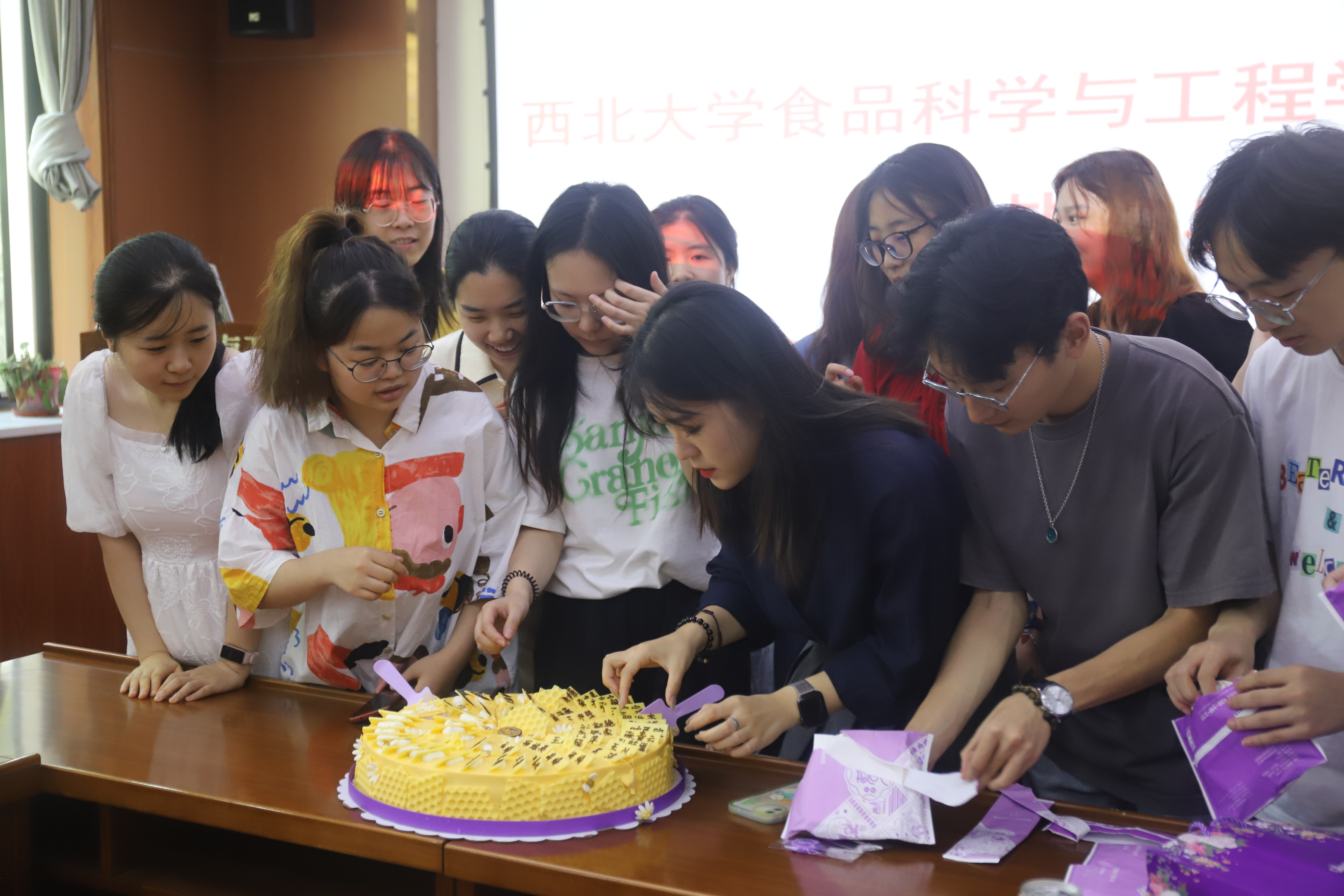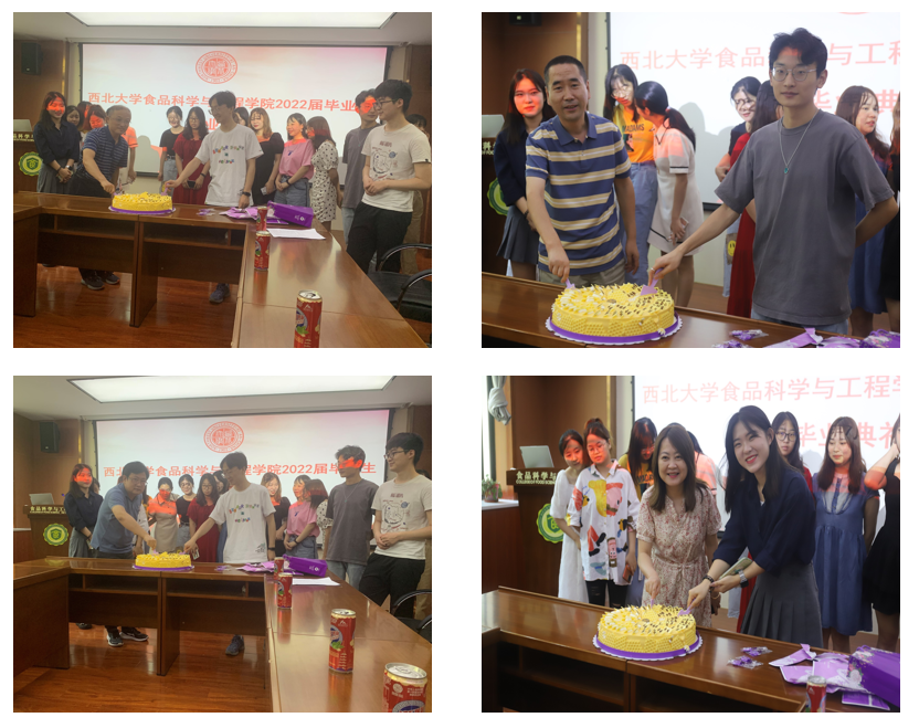 最后,老师们和同学们同切蛋糕,分享毕业的快乐。蛋糕上写有每名毕业同学的名字,祝各位同学前程似锦、未来可期!