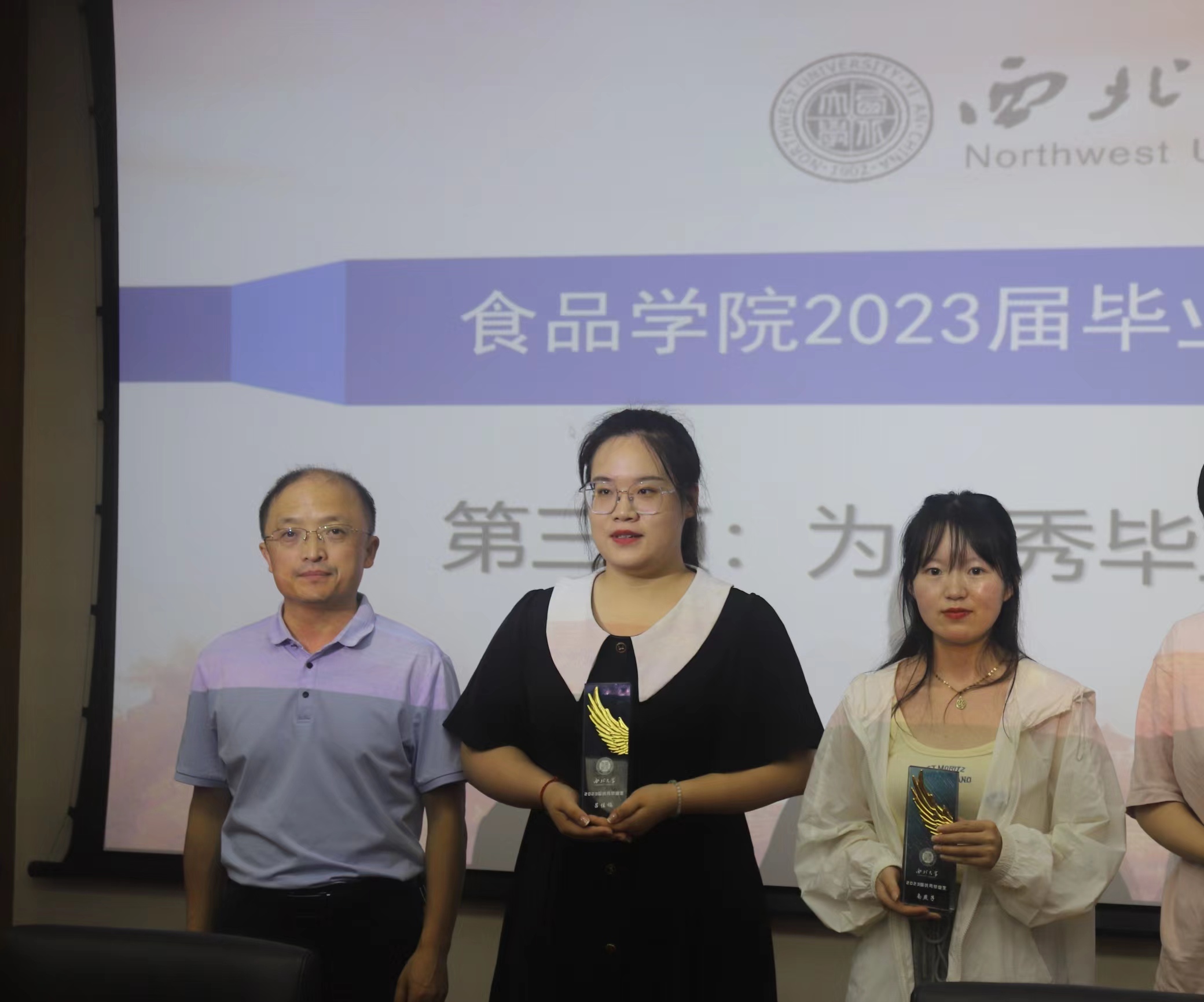 曹炜副院长为优秀毕业生刘晓彤、吕佳楠、南燕子颁发了奖杯。