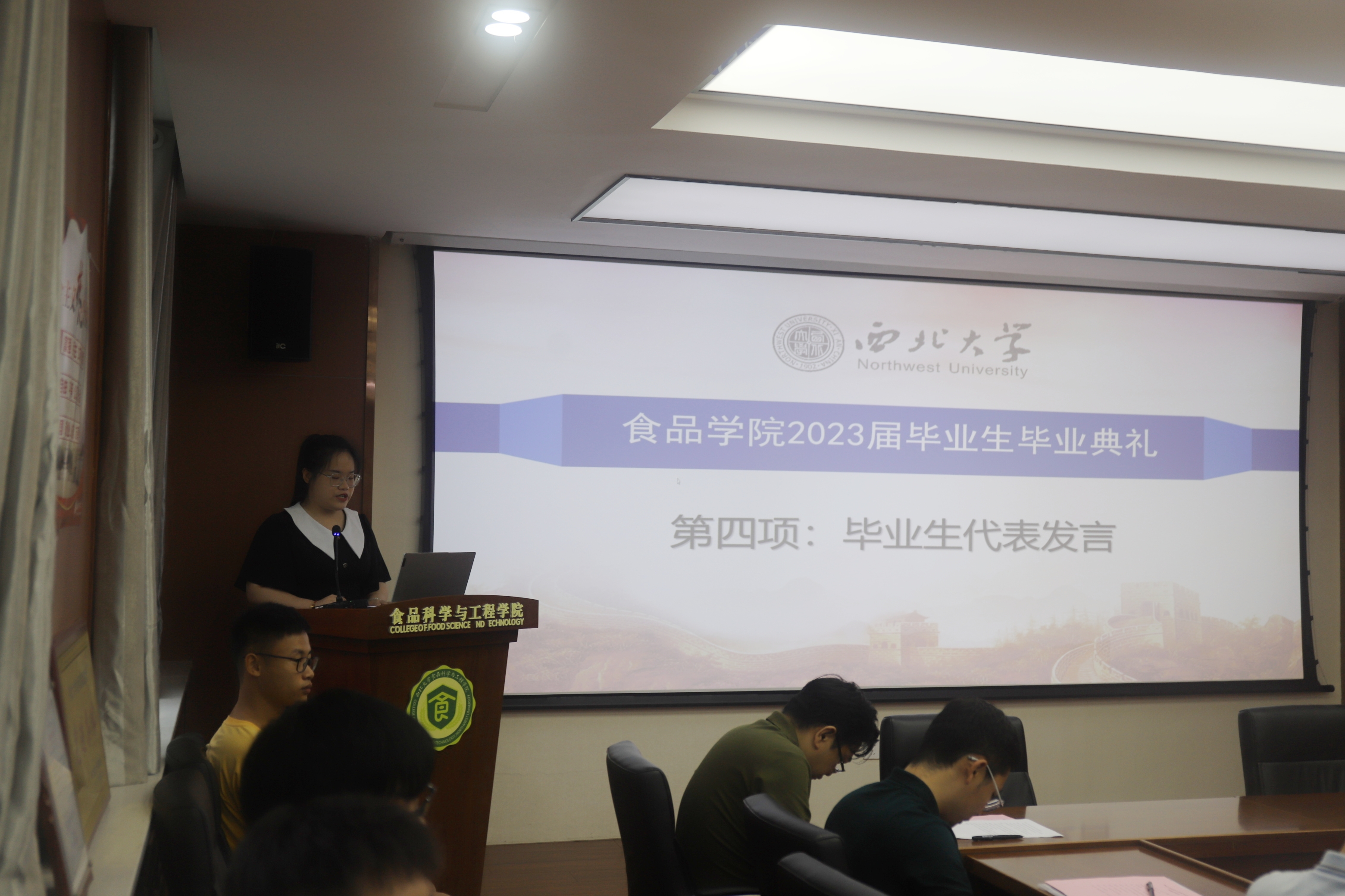 刘晓彤同学在代表全体毕业生发言中回忆了美好的大学时光,表达了对母校母院的感谢及不舍之情,表示将把校训铭记于心、践之于行,在新的征程上,踔厉奋发,勇毅前行,为母校争光。