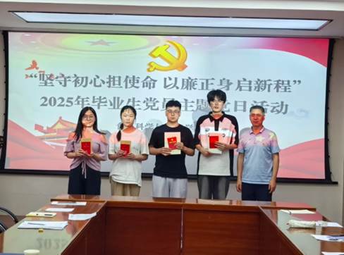 推动深入贯彻中央八项规定精神学习教育走深走实,教育引导毕业生廉洁修身、廉洁从业,系好人生“第一粒扣子”,6月24日下午,学院组织开展“坚守初心担使命 以廉正身启新程”毕业生党员主题党日活动。学院党委书记刘晓忠,毕业生党员和本科党支部学生党员参加活动。