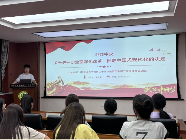 为深入学习贯彻党的二十届三中全会精神,9月25日晚,必赢3003no1线路检测中心食品安全与质量控制团支部在6303会议室开展“学习党的二十届三中全会精神”主题团日活动。团支书谢佳敏同学主持会议,带领大家集体学习。
