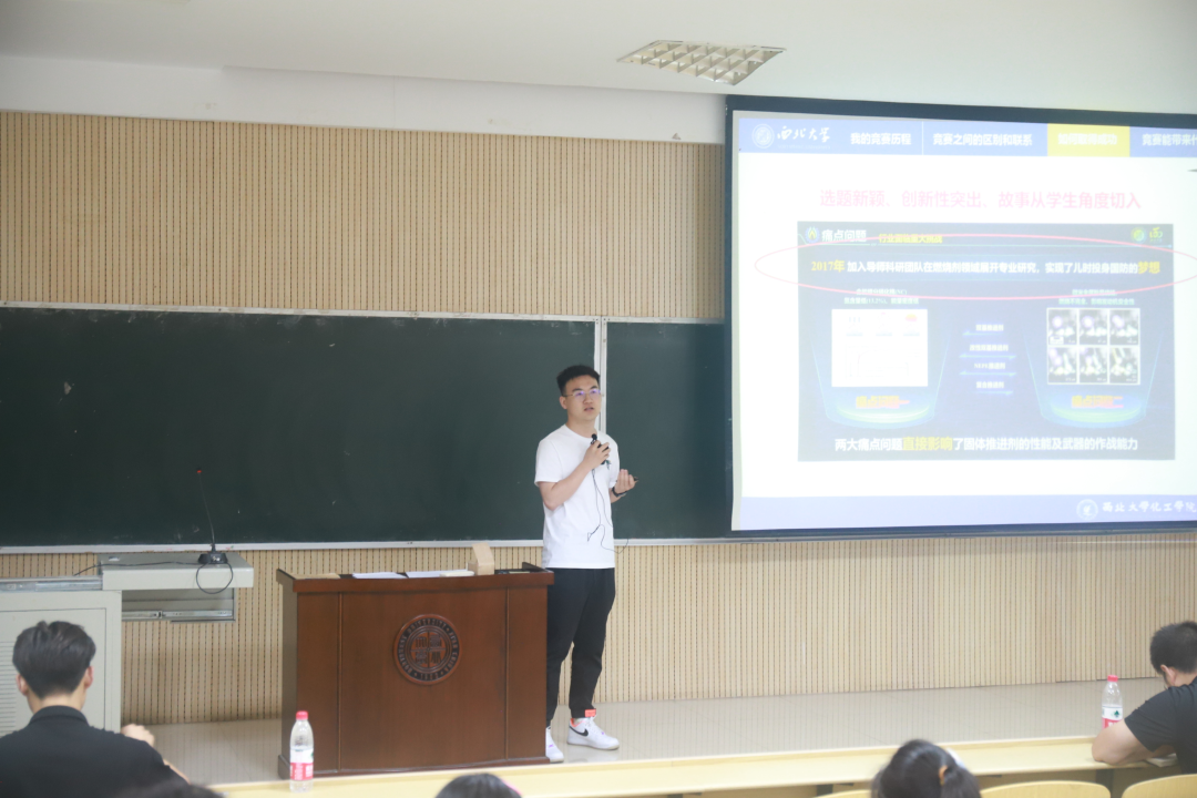 万冲为同学们科普了创新创业项目的竞赛类型,针对各类比赛的关键点进行比较分析,分享了源梦“210”团队成员怀着“拥抱科技、服务国防”的理想,成为国内燃烧剂领域引领者的故事。他鼓励同学们基于自身兴趣,依据项目制定合理的发展规划,多尝试、多探索、多学习、多突破,为国家发展贡献西大青春力量。